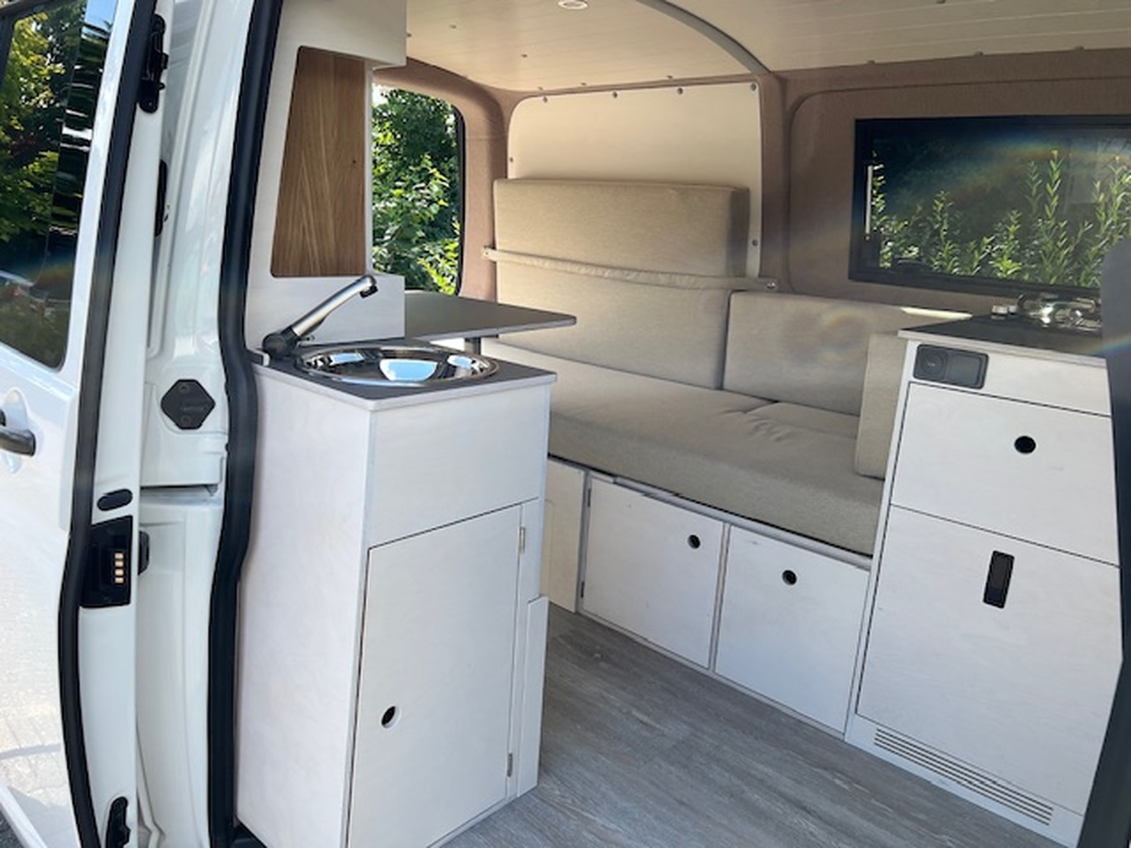 Neben dem Stauraum unter der geteilten Sitzbank und einem funktionalen Küchenkorpus mit Kühlbox bietet ein deckenhoher Schrank auf der Beifahrerseite, mit mehreren Fächern und einem zusätzlichen Regal, reichlich Stauraum für Gepäck, Geschirr, Kleidung und Reiseutensilien.