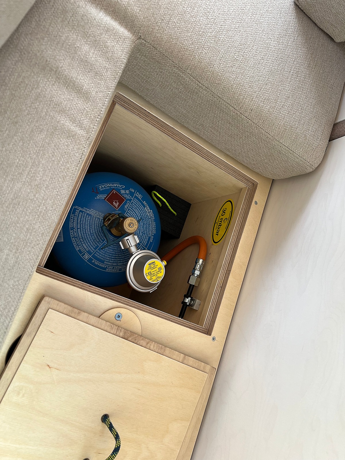 Die für den Gaskocher benötigte 2,8 Kg Propangasflasche ist unter der Sitzbank platziert.